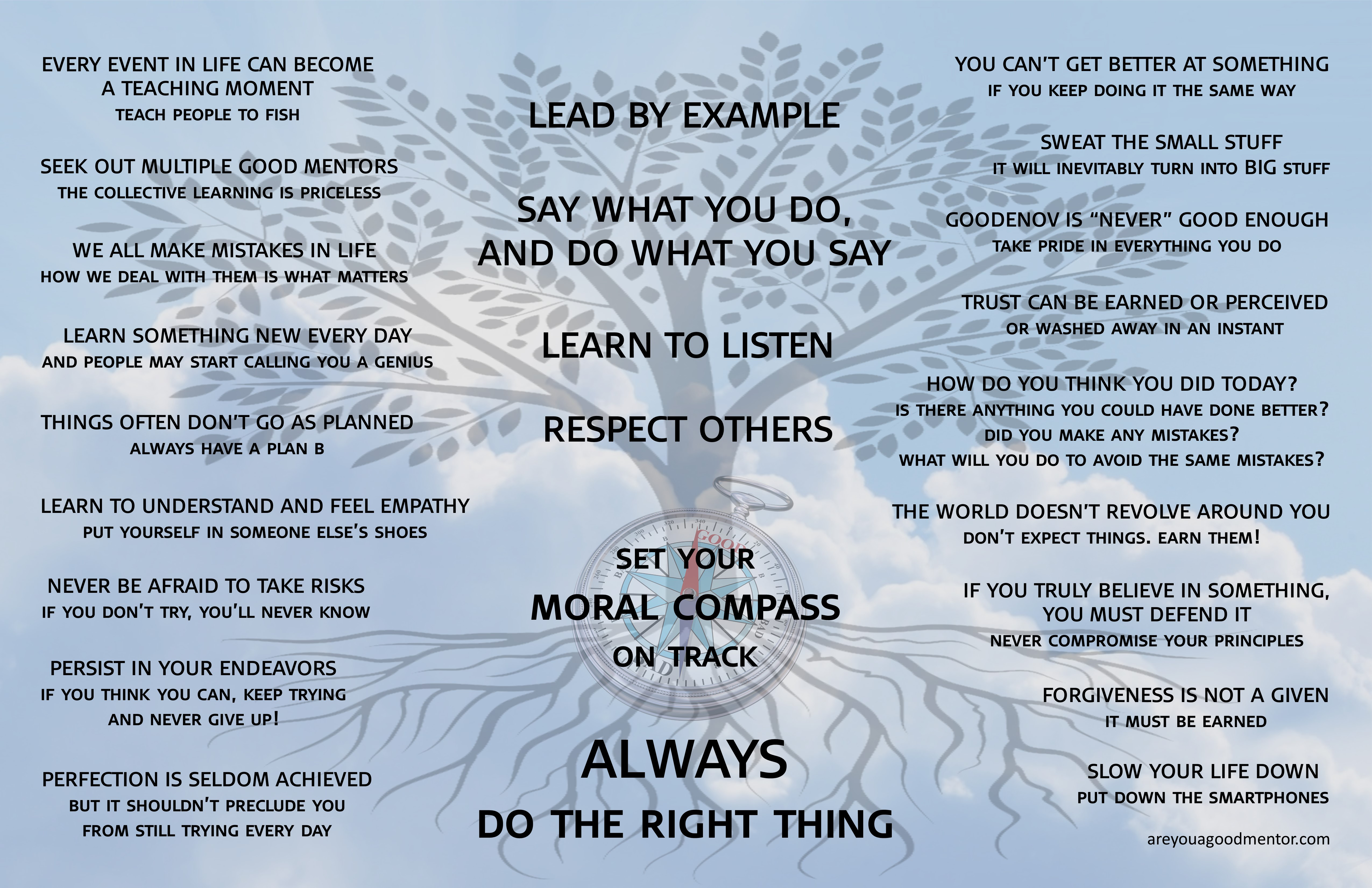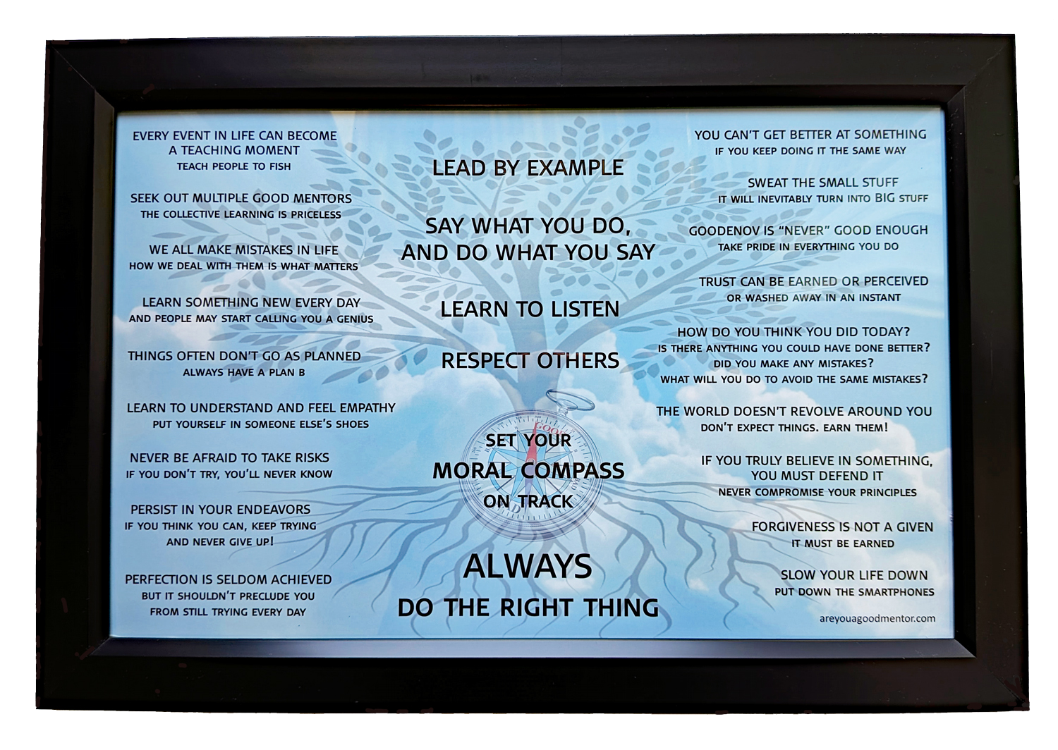 Now available to purchase for your home, this 11" x 17" poster is a compilation of quotes from the book, "Are You A Good Mentor?". Sound advice for any youngster working to establish their personal moral compass.